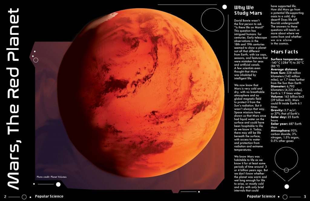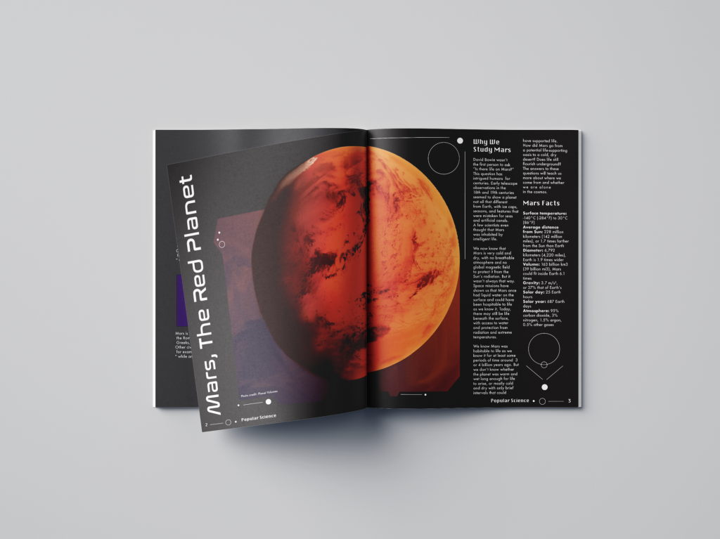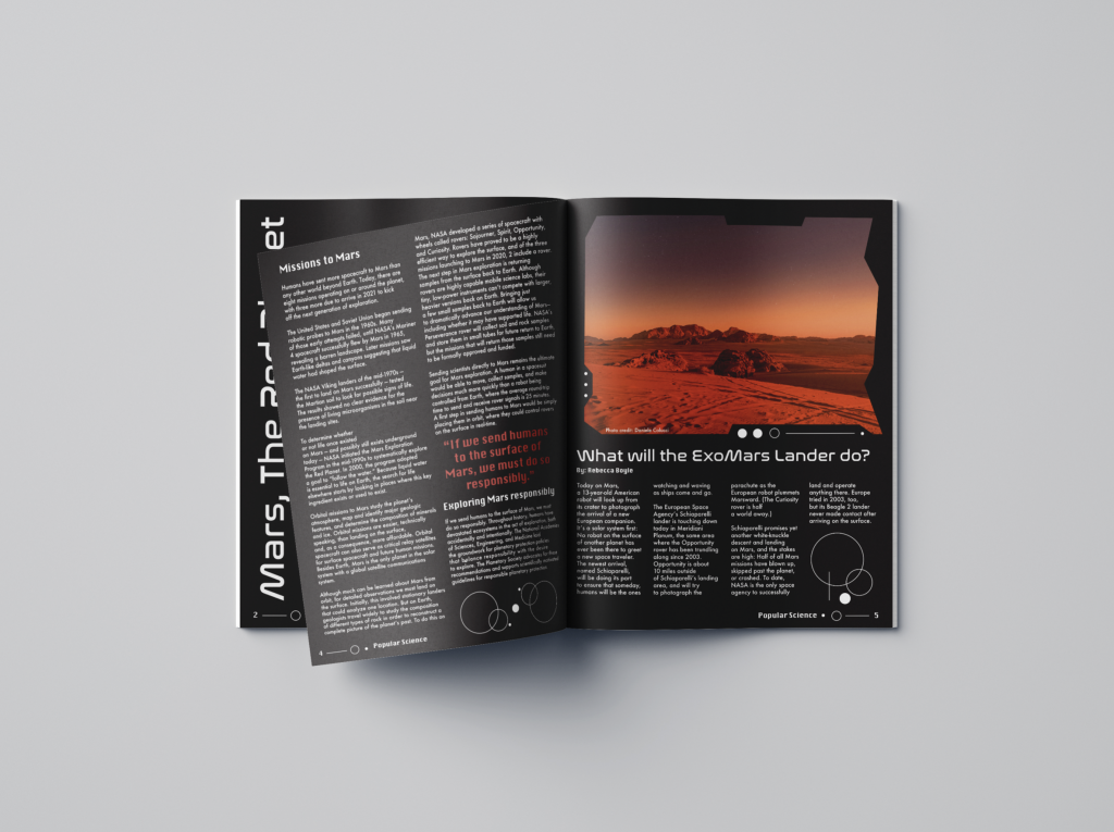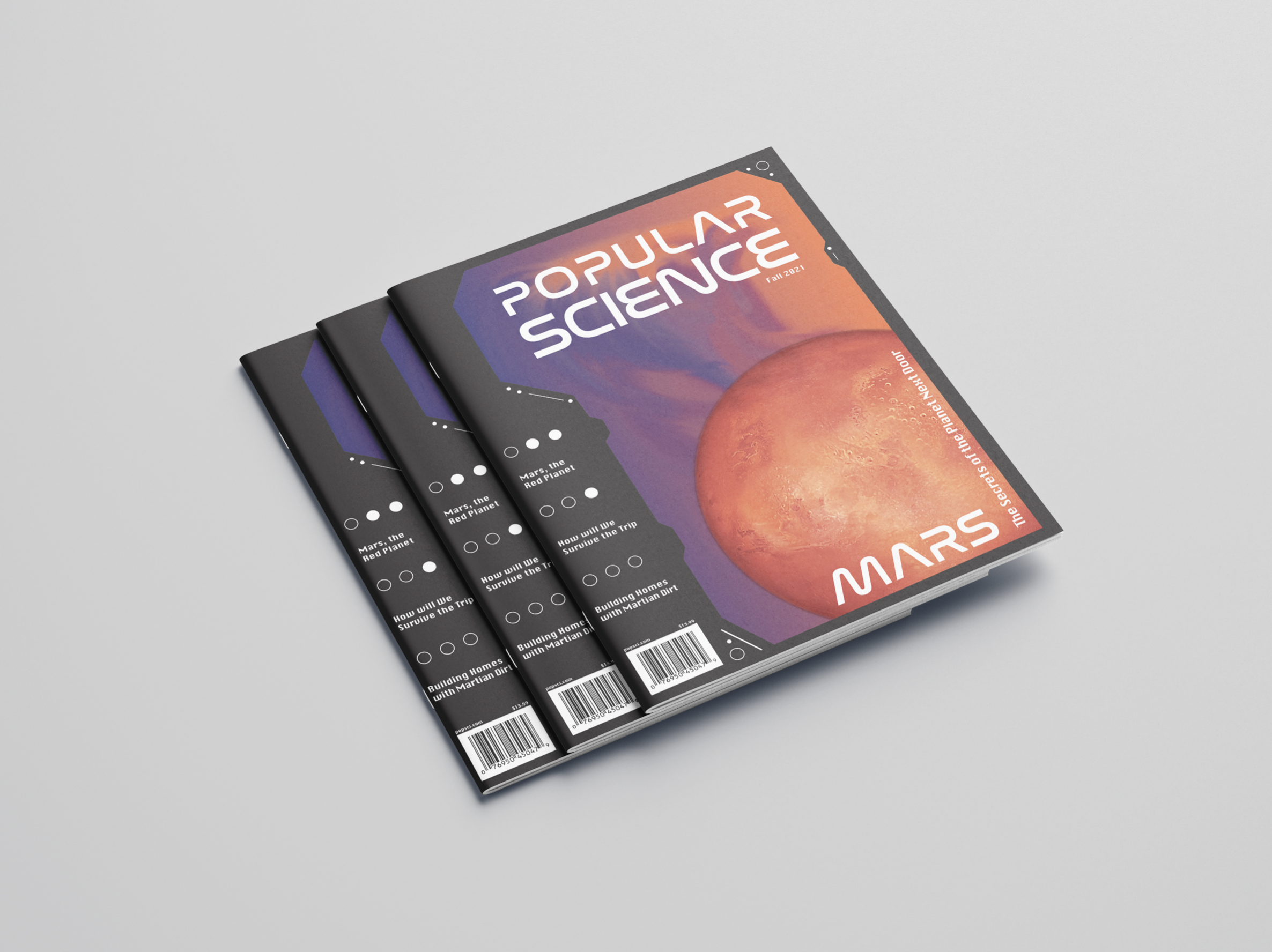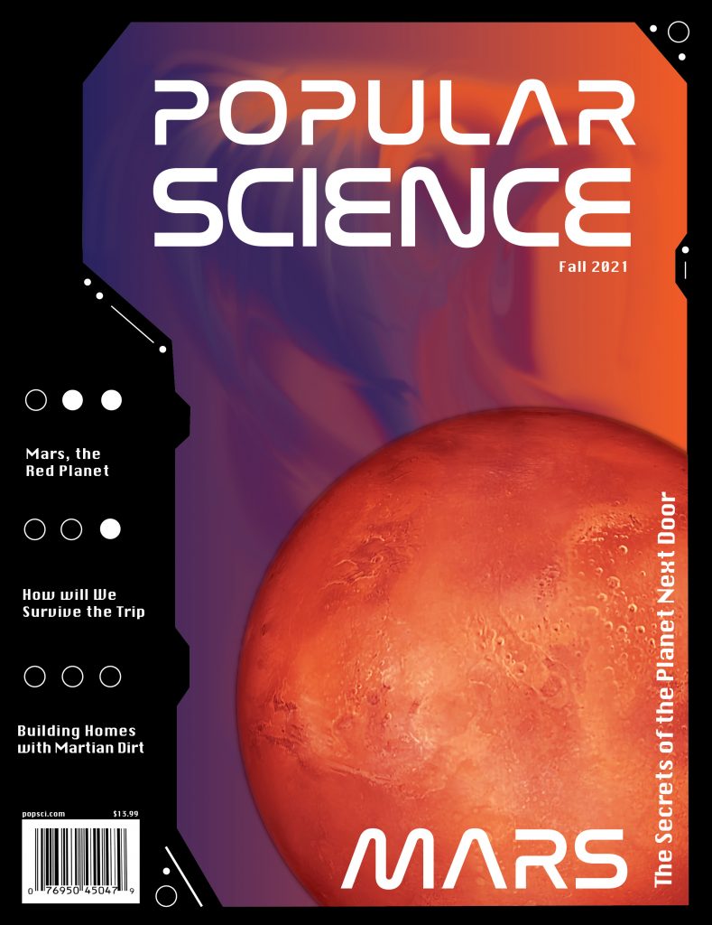 This project is a full redesign of an addition of the Popular Science Magazine. I redesigned the masthead to the edited open source images used, and everything else in between. The thing I cannot claim are the interesting articles themselves. I wanted to give the magazine a sci-fi futuristic feel. The main way I achieved this was from a large use of geometric forms and typography.